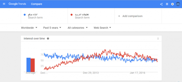 المثال السابق يوضح المقارنة بين كمية البحث عن كلمتى “تطبيقات اندرويد” و ” انشاء موقع ” خلال اخر خمس سنوات ويمكنك تغير المدة الزمنية او اضافات المزيد من الكلمات او تغير البلد